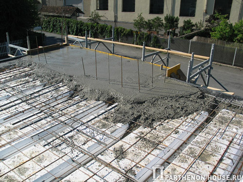 Гайки изготовлены с таким расчетом, чтобы выдержать давление бетона и обеспечить непрерывную заливку бетона с высоты 4 м. Бетонирование можно выполнять традиционными методами, но необходимо следить за тем, чтобы бетонная струя направлялась строго между плитами опалубки. Толщина бетонного слоя 120-250 мм. Класс бетона может быть различным - в пределах от B15 до B25 (в соответствии с прочностными расчетами). Бетонная масса, используемая для бетонирования стен на строительной площадке, должна соответствовать следующим показателям: текучесть бетонной массы S3 (осадка конуса - 100-150 мм) или S4 (осадка конуса - 160-210 мм), максимальный размер фракции наполнителя - 16 мм. Бетонирование происходит в три этапа: 1. до нижнего края оконных проемов; 2. до верхнего уровня оконных проемов; 3. до верхнего края опалубки для стен. Несъемная опалубка для межэтажных перекрытий и крыш