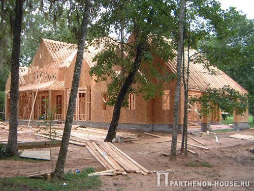 Применяемые в последнее время ориентировано-стружечные плиты (ОСП), получают прессованием прямоугольных плоских щепов, пропитанных водостойкими смолами и парафином, в условиях высокого давления и температуры. Применяют их преимущественно для перегородок и обшивок каркасных домов.