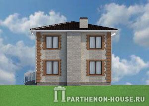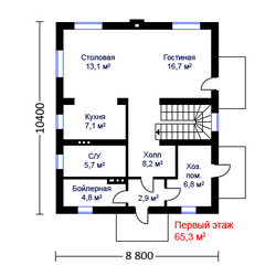 Крыша, обыкновенная четырехскатная, без каких-либо изгибов и поворотов. Стандартные, прямоугольные окна. И один из самых больших плюсов этого дома – небольшие наружные габариты 8.800 м. ширина и 10.400 м. длина. Эти размеры позволяют построить его даже на участке в 1.5 сотки. Из конструктивных особенностей дома также хочется отметить, что строительства здания ведётся из блоков газобетона, одного из самых популярных и экономичных вариантов каменного дома. Междуэтажное и чердачное перекрытие выполнено по деревянному накату, что также существенно сэкономит деньги застройщика. И при всем этом внутреннее пространство дома спроектировано рационально и гармонично.