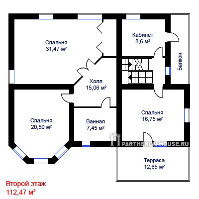 просторная гостиная, кухня, расположенная в эркере, туалет. На втором этаже располагаются холл, три спальни, из одной – выход на террасу, кабинет с выходом на балкон, ванная