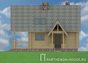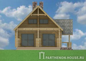 Проект одноэтажного (с жилой мансардой) деревянного гостевого дома или бани из оцилиндрованного бревна. В планировках первого этажа дома (бани): входное крыльцо, прихожая, гостиная, кухня, парная, душевая, санузел, большая терраса. На мансардном этаже гостевая комната, гардероб, кладовая.