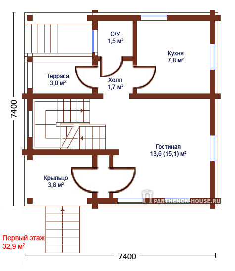 Габаритные размеры дома: 7,40 х 7,40 м.