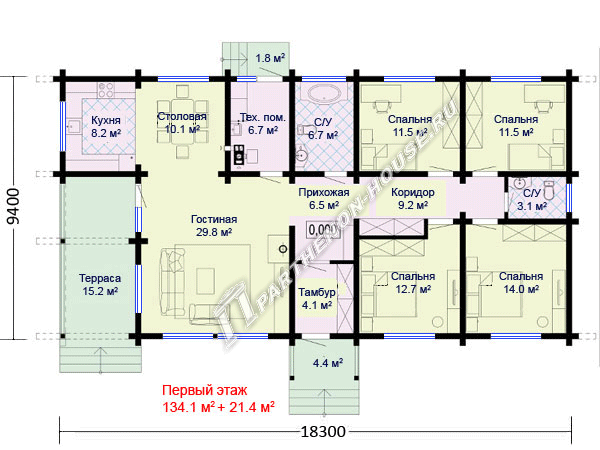 Габаритные размеры дома: 18,300 х 9,400 м.