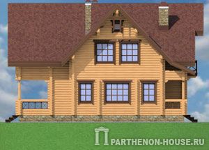 Проект деревянного дома с жилой мансардой в технологии строительства из оцилиндрованного бревна. Дом для круглогодичного проживания. Из особенностей проекта отметим летнюю веранду, просторную террасу, балконы и четыре спальные комнаты на мансардном этаже.