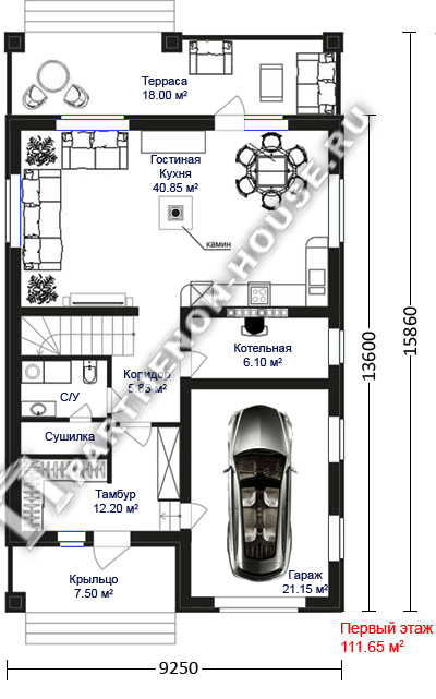 Габаритные размеры дома: 9,250 х 13,600 м.