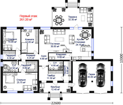 Габаритные размеры дома: 22,600 х 13,300 м. (без террасы и крыльца)