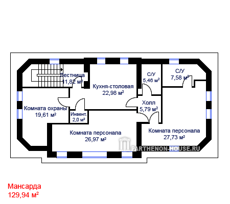 Запроектированное здание является свободно стоящим хозяйственно-гаражным жилым вспомогательным комплексом с подвалом. В подвале комплекса расположены эксплуатационные технические помещения: котельная, бойлерная, кладовая, мастерские и другие аналогичные помещения для размещения эксплуатационных систем. На первом этаже здания два гаража (один из них на два машиноместа) с отдельными въездными воротами, кроме этого есть своя мастерская, инвентарная, кладовая. Мансардный этаж гаражно-хозяйственного комплекса - это жилая часть строения. На этаже разместились две комнаты для обслуживающего персонала, комната охраны, кухня-столовая, два санузла и еще одна инвентарная.