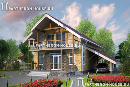 Небольшой по внутреннему пространству и компактный в застройке загородный дом с жилой мансардой для проживания в нем семьи из 3-5 человек. Для увеличения полезной площади дома гостиная на первом этаже совмещена с кухней-столовой. Рационально спроектированная конструкция дома позволяет построить этот дом с открытой террасой и пристроенным навесом для парковки одного автомобиля, так и без них, если размеры участка не позволяет этого сделать. Дом благодаря простым и не сложным конструктивным формам крыши и фасадов имеет максимально экономный бюджет на строительство.