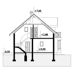 Небольшой, готовый проект жилого дома - простой, уютный, и при этом достаточно удобный. В распоряжении владельцев есть один этаж и мансарда. Подвала и чердака не предусмотрено. Вход в дом предваряет небольшое крылечко, и мы проходим в тамбур. Справа от тамбура находится котельная, это очень удобно, так как на первом этаже проекта готового жилого дома не предусмотрена кладовая, поэтому в котельной можно отвести место под хозяйственные нужды. Из тамбура мы попадаем в небольшой коридор, справа которого находиться кухня, а слева санузел и лестница, ведущая на мансарду. В гостиной готового проекта дома есть камин и выход в сад. Трехгранный остекленный эркер делает гостиную не только светлой, но еще и выразительной с интерьерной точки зрения. Мансарда представляет собой достаточно просторный холл, в который выходят три небольшие комнаты прямоугольной формы. В одной из них есть выход на балкон. С удобством планировки Вы можете ознакомиться, просмотрев .