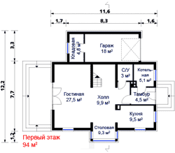 Габаритные размеры дома: 12,2 х 11,6 х 7,44 м.