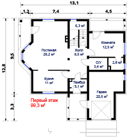 Габаритные размеры дома: 12,8 х 13,1 х 8,20 м.