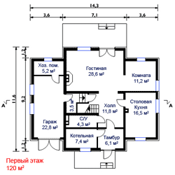 Габаритные размеры дома: 11,0 х 14,3 х 7,92 м.