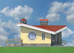 Этот небольшой одноэтажный оригинальный особняк мало кого оставит равнодушным. Уже при одном взгляде на необычный силуэт кровли и фасады с круглыми и