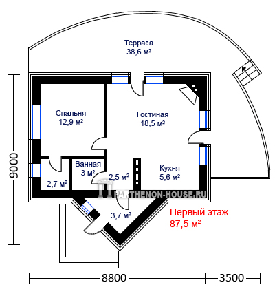 арочными окнами возникает ощущение неординарности постройки. Дом предназначен для постоянного или сезонного проживания небольшой семьи, ценящей уют и