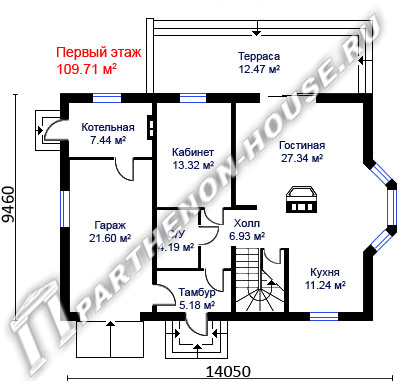 Габаритные размеры дома: 14,050 х 9,460 м.