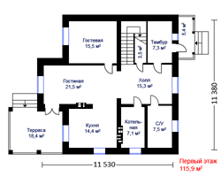 Габаритные размеры дома: 11,380 х 11,530 м. (без крыльца и террасы)