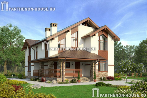 Проект дома с жилой мансардой. Дом в технологии строительства из поризованной керамики с отделкой фасада дома камнем и штукатуркой.