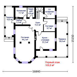 Габаритные размеры дома: 16,840 х 15,150 м.