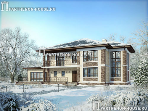 Проект двухэтажного дома с бассейном и сауной. Дом в технологии строительства из кирпича с отделкой фасада дома камнем и лицевым кирпичом.