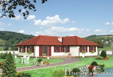 Для небольшой семьи, состоящей из людей разных поколений, представляем из каталога проектов домов из ячеистых бетонов. Проект дома рассчитан на семью из шести человек. Планировка дома очень рациональна. Места общего пользования: гостиная, столовая, кухня - расположены в одной части, а спальные комнаты в другой части. Рядом со спальней родителей расположена небольшая детская комната. В большой ванной можно установить душевую кабину. Кроме того в этом проекте дома из газобетонных блоков предусмотрен отдельный туалет, площадь которого позволяет установить еще одну ванную. Спальни старшего поколения расположены вначале холла. Одно из основных достоинств этого жилья - возможность экономно расходовать тепловую энергию. Правильный подбор материала, из которого изготавливают стены, позволяет сохранить тепло и создает прекрасный микроклимат внутри дома. По теплосберегающим характеристикам стена из газобетонных блоков толщиной 400 мм, аналогична стене из кирпича толщиной 1500 мм.