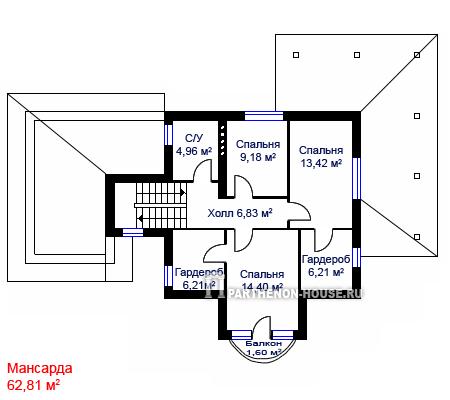 Высота в мансарде: от 1,580 м. до 2,780 м.