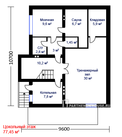 Габаритные размеры дома по осям: 9,60 х 10,70 м.