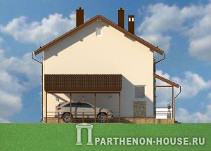 Проект компактного загородного двухэтажного дома с пристроенным навесом для парковки автомобиля. Данный дом подходит для небольших или узких загородных участков строительства.